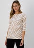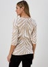 This tee features a striking pattern with beige and white zebra stripes, offering a chic and trendy look. With its perfect fit and 3/4 sleeves, it blends comfort and style seamlessly. Ideal for casual outings or adding a touch of safari-inspired fashion to your ensemble, this tee promises both flair and a comfortable fit.