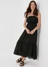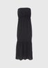 Elevate your style with our stunning Black Bandeau Maxi Dress. This elegant piece features a strapless bandeau neckline, creating a sleek and sophisticated look. The flowing silhouette gracefully cascades to a maxi length, elongating your figure. Subtle ruching at the waist adds texture and emphasizes your curves, while the playful ruffle tier at the bottom provides movement. Crafted from lightweight fabric in a sublet black colour, this dress promises both comfort and chic appeal. Perfect for summer evenings or special occasions!