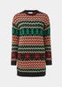 Colourful and charming, this billowing tunic dress is perfect for celebrating the festive season, Patterned with Christmas trees, snowflakes and chic diamonds, this snuggly piece comes with a black base to make this detailing truly stand out. It's finished with a ribbed neckline, cuffs and hem for added stretch. Partner with tights and boots. Model Height: 5ft 9.