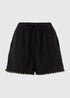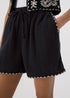 Elevate your summer wardrobe with these chic Black Co Ord Linen Shorts. Crafted from breathable linen fabric, these shorts promise both style and comfort on warm days. Featuring an easy pull-on design with an elastic waistband, they ensure a perfect fit without compromising on ease. The intricate white embroidery along the hem adds a subtle yet sophisticated touch, making them ideal for pairing with your favourite blouse or crop top. Finished with playful tassel details, these shorts are perfect for creating effortless day-to-night looks.