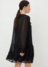 Chic, playful and made to stand out, this mini dress brings a romantic edge to your wardrobe. Crafted from a semi-sheer black dobby texture, it features a built-in cami for comfortable, demure coverage. Cut to a flattering mini length, the silhouette is elevated with statement ruffle trim through the front and cuffed long sleeves for added drama.