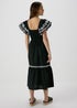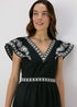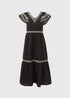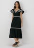 Learn moreCrafted from a premium black fabric, our Black Embroidered Trim Dress exudes elegance and sophistication. This stunning dress features intricate white embroidered trims that add a touch of femininity and charm. The figure-flattering silhouette accentuates your curves, while the midi length adds a touch of modesty. Featuring a feminine v-neckline and frilled sleeves. Perfect for any special occasion, from a night out with friends to a formal event, this dress is sure to turn heads wherever you go. Pair with strappy heels and a clutch for a glamorous evening look or dress it down with sandals and a denim jacket for a casual daytime outfit.