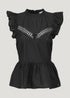 Update your selection of stylish blouses with this stunning Victoriana number. Pretty, polished, and totally on-trend, the blouse is styled in black and features gorgeous frill detailing to the shoulders, hem and high neckline. Intricate cut-out detailing adds an exceptionally feminine final touch. * Lenght: 57.5cm. * Model Height: 5ft 9 1/2.