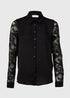 A perfect blend of classic and contemporary fashion this shirt is crafted with precision. It features a smooth, black body complemented by intricate lace sleeves that add a touch of sophistication and allure. The button-down front offers versatility in styling, making it a suitable choice for both formal and casual occasions. Pair it with your favourite skirt or trousers to create an ensemble that speaks volumes about your exquisite taste.