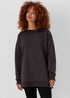 Indulge in unbeatable cosiness on your well-deserved days off with our exquisite black sweatshirt. Featuring comfortably stretchy cuffed sleeves, a classic crewneck, and an elegant longline design, it offers generous coverage. This versatile piece effortlessly pairs with joggers or leggings, elevating all your cherished laid-back activities to a new level of comfort and style. Model Height: 5ft 9.