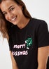 Learn moreLooking for a chic outfit for under the mistletoe? Styled with a sleek black base, this tee features a comfortable crewneck, breezy short sleeves and a fun mistletoe print alongside the slogan 'merry kissmas'. Cut with a super soft fabric for extra cosiness, it's perfect for getting you in the Christmas spirit. Model Height: 5ft 9 1/2.