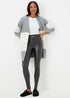 Bring a glossy look to your leggings collection with this cool pair, fashioned with black PU fabric. Tailored with stretch for easier movement, the seam front detailing brings that added bit of style. Model Height: 5ft 10.