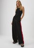 Learn moreElevate your wardrobe with these Black Side Stripe Tapered Trousers, a perfect fusion of style, comfort, and versatility. These trousers are designed to make a statement, whether you're heading to a business meeting, a casual outing, or a night out on the town. Crafted from a comfortable textured flowing fabric and designed with a long wide leg. These tapered trousers feature a classic black hue and a striking red side stripe, with a elasticated waistband and tie waist detailing. Pair with a simple tee, blazer and trainers for a relaxed weekend look or dress them up with a cami top and heels for a night out.
