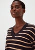 Pop fun colour into your collection with this uber cosy jumper. With a black base and horizontal stripes in beige, this piece is finished with cuffed sleeves for an added dash of snug and a gorgeous V neck for a flattering finish. A cold-weather essential, team it with jeans and trainers.
