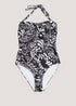 Heat up your holiday wardrobe with this chic swimsuit. Styled with a contrasting black and white leaf print, the timeless swimming costume features a bandeau neckline, complete with slim halter-neck tie fastenings for added elegance. Perfect for pairing with a floaty kimono and a floppy hat for added style points. Model Height: 5ft 9 1/2.
