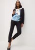 - Vibrant all-over palm print in light blue and white