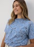 This tee features a beautiful floral print that is sure to make you stand out. The burnout fabric gives the tee a unique texture and makes it comfortable to wear. The tee is made of high-quality materials that are durable and long-lasting. The blue color of the tee is perfect for any occasion and can be paired with jeans or shorts for a casual look.