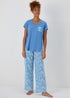 Lounge in style with these blue pyjamas. Crafted from a soft and stretchy cotton fabric for all-night comfort, the set includes a pair of full-length bottoms complete with an elasticated waist. Up top, you'll find a short-sleeved tee finished with a flattering scoop neckline. An all-over floral print completes the look.