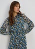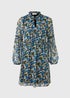 This blue dress is adorned with a delightful print featuring white, blue, and green flowers, creating a vibrant and eye-catching look. The tie-neck detail adds a touch of sophistication, while the frilled elements provide a playful and feminine flair.