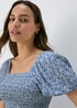 Embrace vintage-inspired elegance with the Blue Sheered Co Ord Blouse Top. Crafted from delicate sheer fabric, this blouse features intricate blue floral patterns that exude a fresh and feminine charm. The square neckline elegantly frames the collarbone, while the short puff sleeves add a touch of whimsy. The sheered texture on the bodice provides a flattering fit, and the cropped length makes it versatile for pairing with high-waisted skirts or pants. Whether you’re heading to an evening event or a casual outing, this blouse effortlessly combines timeless design elements with contemporary style.