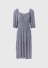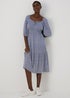 Dare to be bold in our enchanting blue tile print shirred midi dress. This captivating number boasts a mesmerizing blue tile print that commands attention wherever you go. Expertly crafted from a soft and flowy material, this dress drapes beautifully, offering both comfort and sophistication. The tiered skirt adds an extra touch of flow and detail to this dress while the tie top ensures the perfect fit. Pair this dress perfectly for every occasion with heels for a night out look or pair with a denim jacket and trainers for a casual everyday look.
