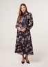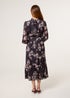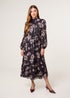 Blue Vanilla Black High Neck Floral Puffball Pleated Midi Dress