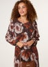 Blue Vanilla Brown Large Watercolour Floral Scoop Neck Puffball Pleated Dress