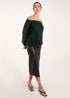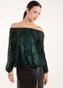 A sparkly, sophisticated party bardot blouse to wear now and love forever! This sequin blouse will speak for itself, teamed with PU trousers, court heels and a red lip.
