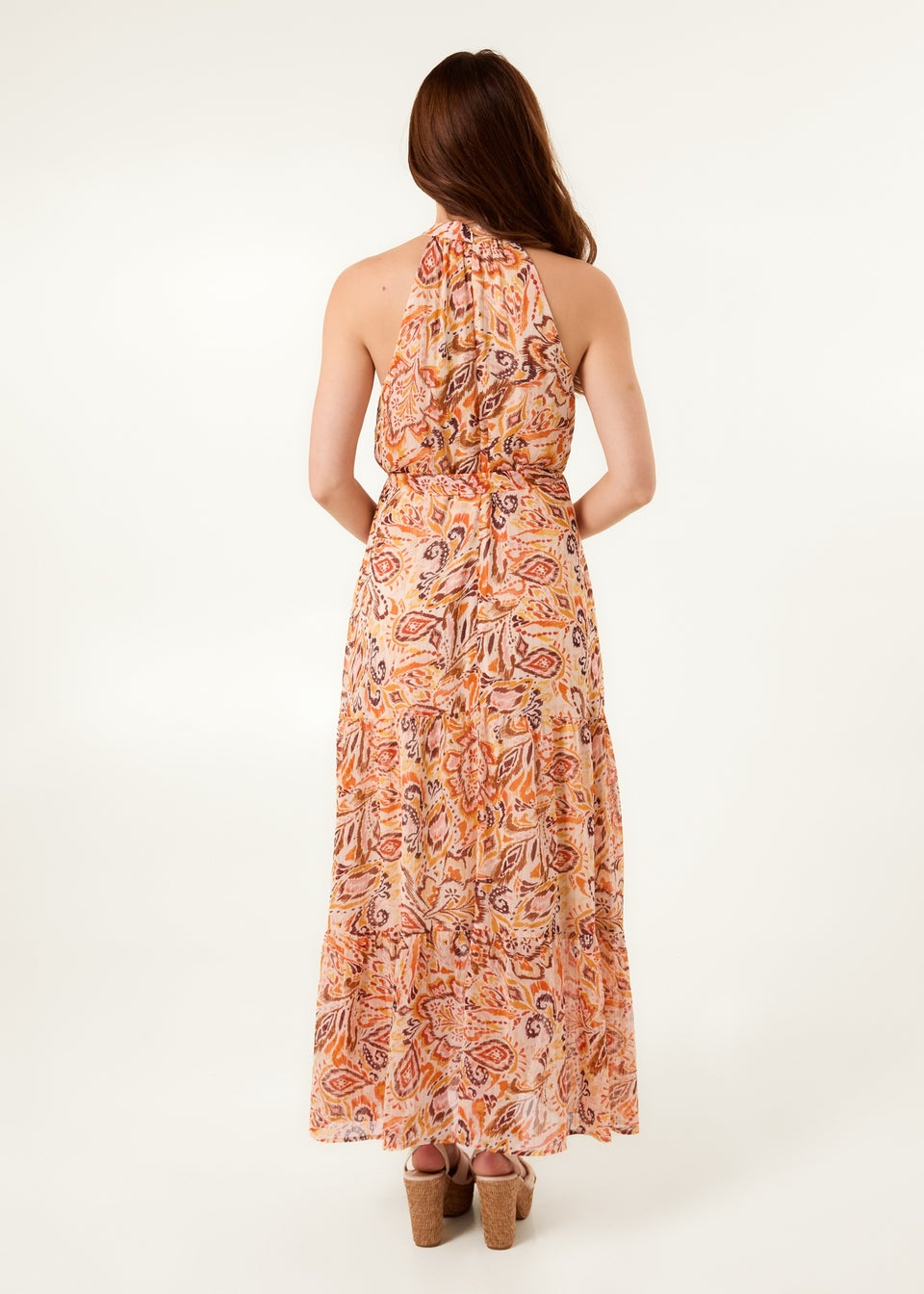 Blue Vanilla Orange Halter Neck Belted Waist Maxi Dress