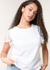 This simple and stunning t-shirt is perfect for polka dot lover! It looks lovely in its muted solid color and polka dot frill mesh sleeves that really make this top a looker.