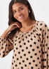 This versatile dress will see you through workdays and evenings out alike. Styled with a timeless brown spot print and featuring frill detailing to the skirt for a sweet touch, this soft mini dress is finished with elasticated sleeves and a playful neckline. Wear it with sandals or loafers to complete the look.