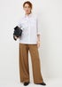 These camel wide leg formal trousers offer a refined, minimalist look with a softly tailored finish. Designed with a high-rise waist for a flattering silhouette, they fall into a relaxed wide leg that creates effortless movement and polish. Subtle front seams add structure, while the soft, stretch fabric gives a clean, streamlined appearance. Versatile and easy to style, they pair seamlessly with blouses, knits, or tailored jackets for a modern, understated approach to smart dressing.
