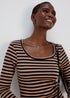 This elegant top features alternating camel and black stripes that gracefully adorn the fabric, offering a visual appeal that is both classic and contemporary. The scoop neck design adds a touch of femininity, while the long sleeves provide warmth, making it a versatile piece for every season. Crafted from high-quality materials, this top promises not only style but also comfort and durability. Pair it with your favourite jeans or skirt for a casual yet polished look.