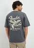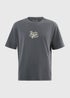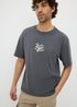 Laid-back with a bold edge, this charcoal T-shirt is crafted from soft jersey fabric for comfortable everyday wear. Cut in a relaxed fit with short sleeves and a classic crew neckline, it features a subtle front graphic, balanced by an oversized statement graphic across the back for added impact.