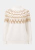 Learn moreElevate your winter wardrobe with our cream jumper, a cosy essential that combines style and comfort effortlessly. Crafted from a luxuriously soft knit, the shimmering metallic fair isle pattern adds a touch of festive charm, making it perfect for holiday gatherings. The ribbed cuffs and hem provide a snug fit and added stretch, too. Stay warm, look chic, and embrace the season in this timeless classic. Wear the look with jeans and boots. Model Height: 5ft 9.