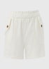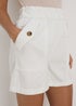 Learn moreStep into effortless style with the Cream Paperbag Shorts. These chic shorts combine contemporary design with comfortable fit, making them a versatile addition to your warm-weather wardrobe. Features a fashionable paperbag waist with a cinched, elasticized band, with side flap pockets with buttons, in a versatile cream hue. Made from a high-quality blend of twill material that offer a soft, breathable feel and ensure all-day comfort. Pair with a tucked-in blouse and sandals for a chic office look or dress it down with a T-shirt and sneakers for a casual day out.