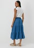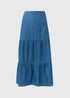 Learn moreOur Denim Tiered Maxi Skirt is the perfect addition to your casual wardrobe. Crafted from 100% cotton, it's soft, comfortable, and easy to care for. With its tiered design and flattering shape, this skirt will flatter any figure. This maxi skirt features a elastic waistband, in a versatile denim blue hue. Pair it with a simple cami and sandals for a relaxed summer look or dress it up with a blouse and heels for a night out.