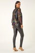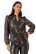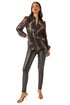 Dusk Foil Frill Mesh Shirt from Roman. Get ready to shine this Autumn/Winter season with this stunning foil print top. Featuring an all-over foil printed mesh fabric, this top is detailed with delicate frills at the high neckline and a flattering tie front. The long sleeves add sophistication while the top finishes at the low hips for a modern look. Perfect for adding a touch of glamour to your outfit, this top also features a frill at the top of the neckline. Pair with tailored trousers and heels for a chic and stylish ensemble that will turn heads wherever you go!
