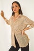 Dusk Sequin Button Through Blouse from Roman. Bring some sparkle to your Autumn Winter wardrobe with our dazzling sequin button through blouse. Adorned in shimmering embellishments, this shirt style blouse features a full button through detail for easy styling. Cut to a hip length finish, this comfortable piece is crafted from a mesh fabric with dazzling sequin detailing. The long drop shoulder sleeves add a touch of elegance. Pair with faux leather pants and ankle boots for a trendy fall look.