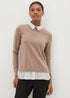 Learn moreAdd a stylish twist to your wardrobe with the Et Vous Camel Spot Print Shirt Jumper. This unique design features a chic, camel-coloured long sleeve jumper layered over a contrasting spot print shirt, offering a fashionable mix of textures and patterns. The jumper's cosy fit provides warmth and comfort, while the shirt underneath peeks through at the collar and hem, adding a playful touch of pattern.