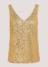 Sparkle and shine in this gorgeous vest top! Styled in a timeless gold tone, it features a chic V neck and it's embellished in signature sequins for a luxurious finish. Cut with a super soft material, it's a must-have in your occasion wear. Model Height: 5ft 9.