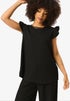 Stay stylish and comfortable all day long with our Black Frill Sleeves Textured Oversized Top. The frill sleeves add a touch of fashion-forward flair while the textured fabric provides a flattering and effortless fit. Perfect for any occasion, this top will elevate your wardrobe to new heights.