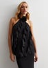 Learn moreGlam your style this season with our new black ruffle top designed in a versatile colourway and stylish halter neckline, this top must be your favourite out going pair. Style up with a jeans, trainers for a daytime look or glam up with trousers and stilettos at night.