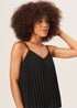 Effortlessly elevate your style with our Black Strappy Pleated Cami Top. The strappy design adds a touch of sophistication, while the pleated detailing adds texture and dimension. Perfect for both day and night, this top will have you looking effortlessly fashionable.