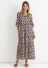 Learn moreThis casual maxi dress features a beautiful brown geometric print and a smock design for comfort and effortless style. Perfect for any occasion, this dress will keep you looking chic and comfortable all day long.