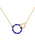 This necklace features two interlocking rings, one adorned with a vibrant blue enamel finish and the other plated in warm yellow gold over sterling silver.