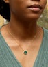 This necklace features a round malachite stone, celebrated for its deep green color and natural striations, set in sterling silver with a warm yellow gold plating.