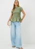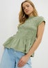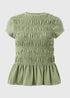 Freshen up your new season style with this charming top. Styled in green, it's crafted from 100% cotton and features a trendy acid wash design, shirred detailing and a flattering peplum hem. Short sleeves and a classic crew neckline keep it comfortable and easy to wear, making it perfect for casual days with a stylish edge.