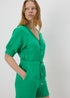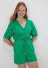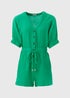 Learn moreStep out in style with our Green Double Cloth Playsuit, a must-have for your summer wardrobe. This chic and versatile playsuit is crafted from high-quality 100% cotton cloth look fabric that feels soft against your skin, ensuring all-day comfort. Perfect for warm weather this playsuit features a v-neckline, button up fastening, elasticated waistband with a tie detailing and short cuffed sleeves. Pair it with your favourite sandals for a casual summer vibe or dress it up with a pair of heels and statement jewellery for a sophisticated evening look.