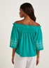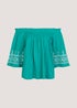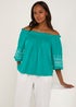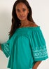 You'll look chic and sophisticated on warm-weather days in this dashing top, featuring a Bardot style to let your shoulders breathe when the temperature rises. In soft and stretchy cotton fabric, the green top is finished with regal embroidery to the comfy sleeves to inject that extra bit of interest. The perfect partnering piece for shorts, jeans and trousers alike. Model Height: 5ft 10.