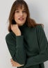 This knitted masterpiece features a chic ribbed design, ensuring a stylish texture, while the high neck adds a touch of sophistication. The dark green hue exudes elegance, making it a perfect choice for both casual and dressy occasions.