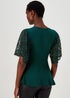 Indulge in the allure of this Forest Green Lace Angel Sleeve Jersey Top. The delicate floral cut-outs on the sleeves bring a touch of sophistication to your outfit. This top is perfect for both special occasions and adding a stylish touch to your everyday ensemble. Embrace the timeless elegance of lace and elevate your fashion with this uniquely designed piece in a rich forest green shade.
