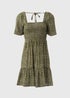 Charm meets comfort in our Green Shirred Bodice Mini Dress. Delicate shirring ensures a flattering fit, while puff sleeves with tie-up details add whimsy. The subtle floral pattern and tiered mini skirt create playful movement. Crafted from lightweight fabric, it’s perfect for sunny days or casual evenings. Dress it up with heels or down with flats for versatile style.
