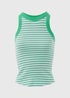 Step into the spotlight with the vibrant Green & White Stripe High Neck Ribbed Vest. Designed with a high neckline and a sleeveless silhouette, this ribbed vest offers both comfort and style. The alternating green and white stripes create a fresh and lively look, perfect for casual wear. Pair it with light blue denim jeans for a relaxed yet fashionable outfit. A must-have addition to your everyday wardrobe!