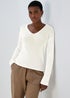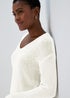 Crafted with meticulous attention to detail, this piece is designed to elevate your wardrobe essentials. The subtle sparkle embedded in the rich ivory fabric illuminates under light, offering a sophisticated shimmer that’s perfect for both day and night wear. The flattering V-neckline accentuates the collarbone while the finely knit texture ensures a snug fit, keeping you warm yet stylish.